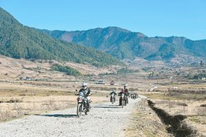 The route passes through Wangdue Phodrang, an important regional centre, before continuing deeper into forested hills and increasingly remote terrain. Dense pine and rhododendron forests line the road, broken by small villages, prayer wheels, and roadside chortens. Traffic is minimal, and the riding feels calm, rhythmic, and immersive — classic Bhutan.